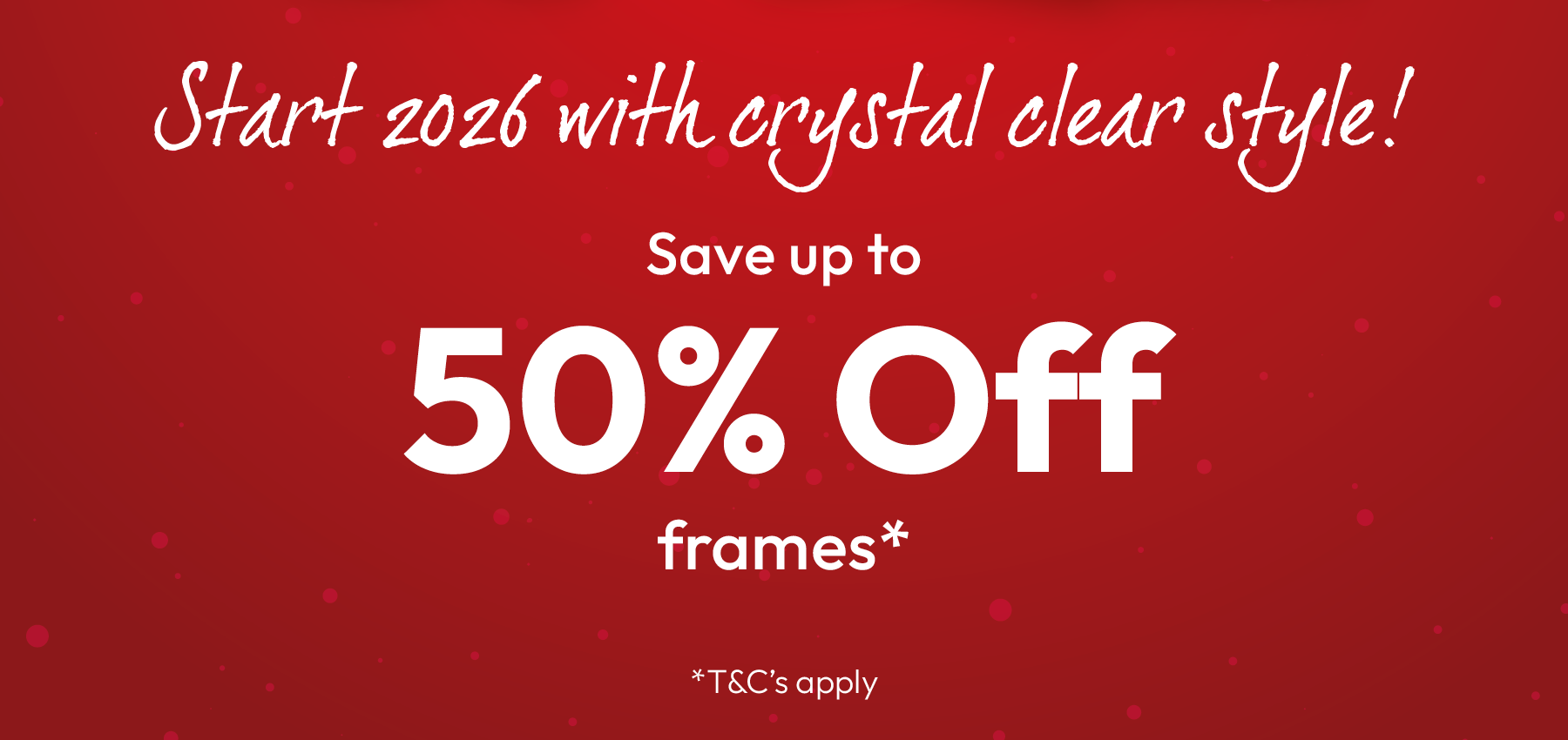 Start the new year with crystal clear style! Our January savings event is the perfect opportunity to update your look with eyewear that truly represents you. Save up to 50% off frames throughout January 2026.